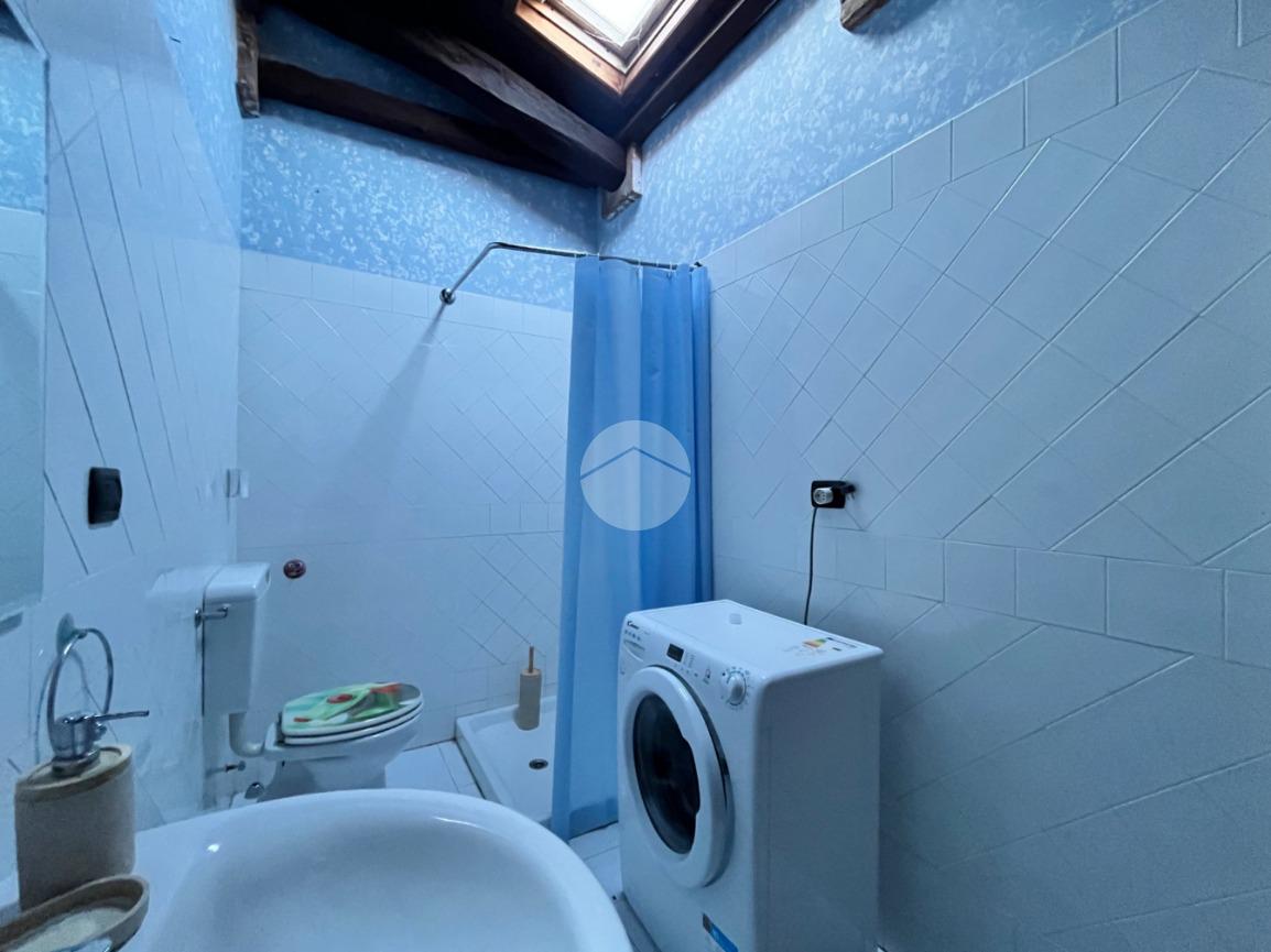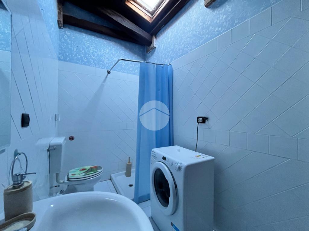 L’ingresso si apre direttamente su un accogliente soggiorno con angolo cottura, uno spazio luminoso e ben distribuito, ideale per la vita quotidiana e i momenti di convivialità. Le travi a vista e le altezze tipiche della mansarda conferiscono all’ambiente un’atmosfera calda e suggestiva.
