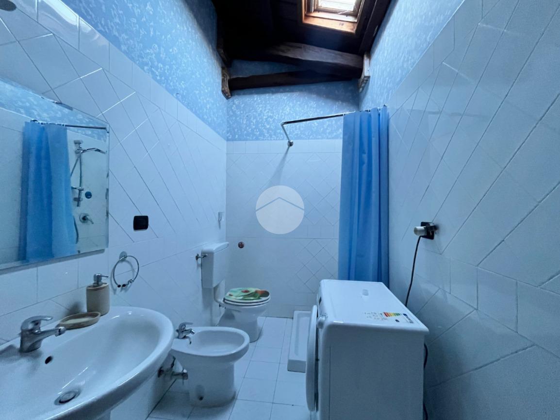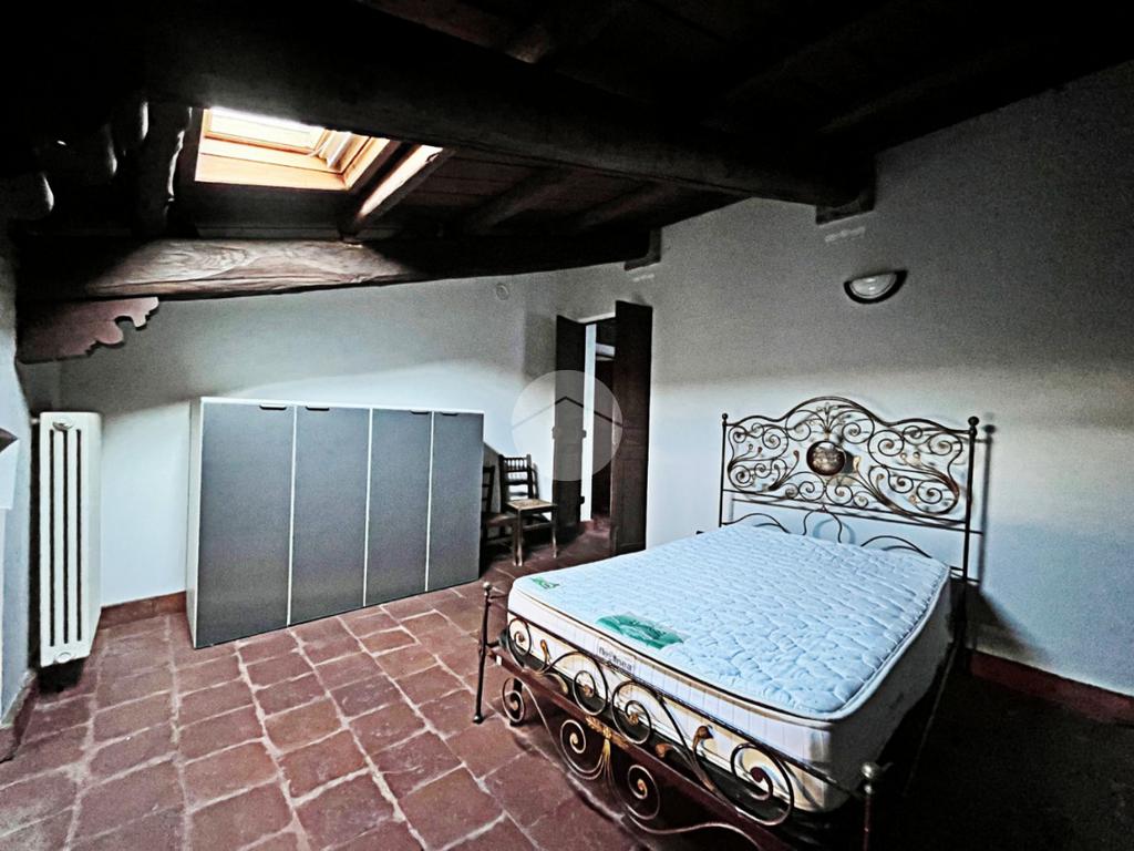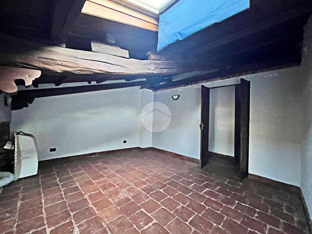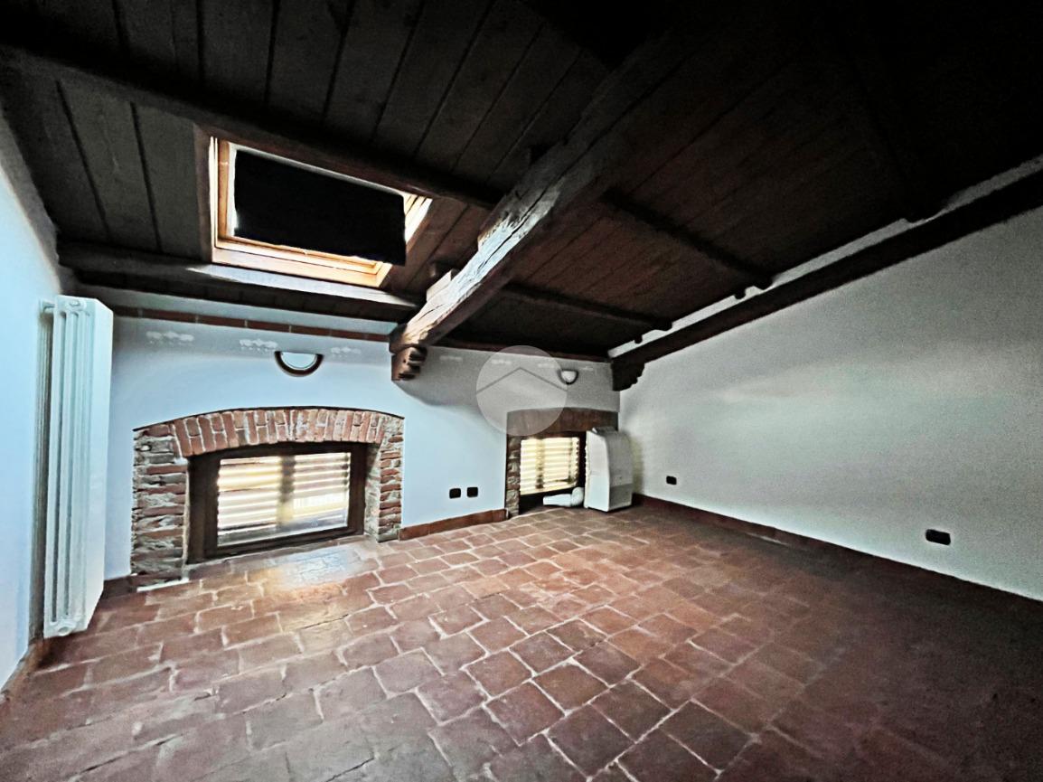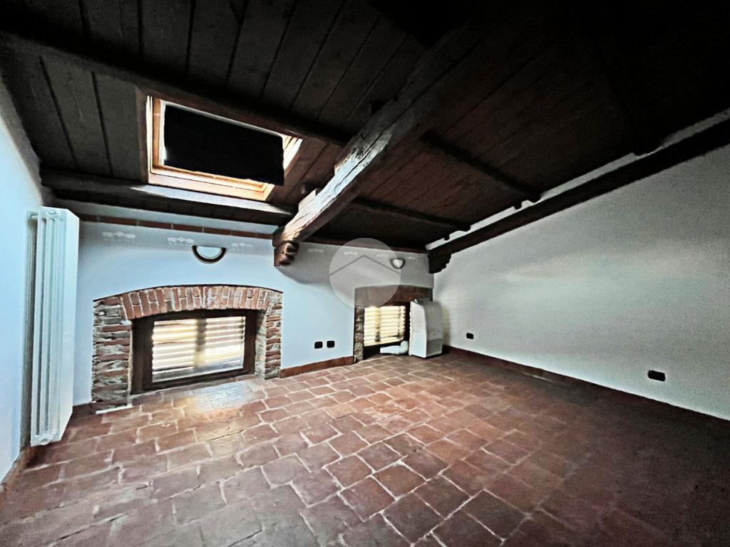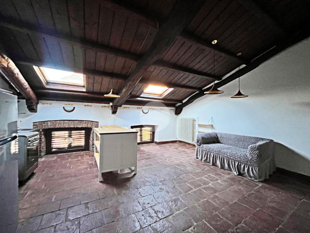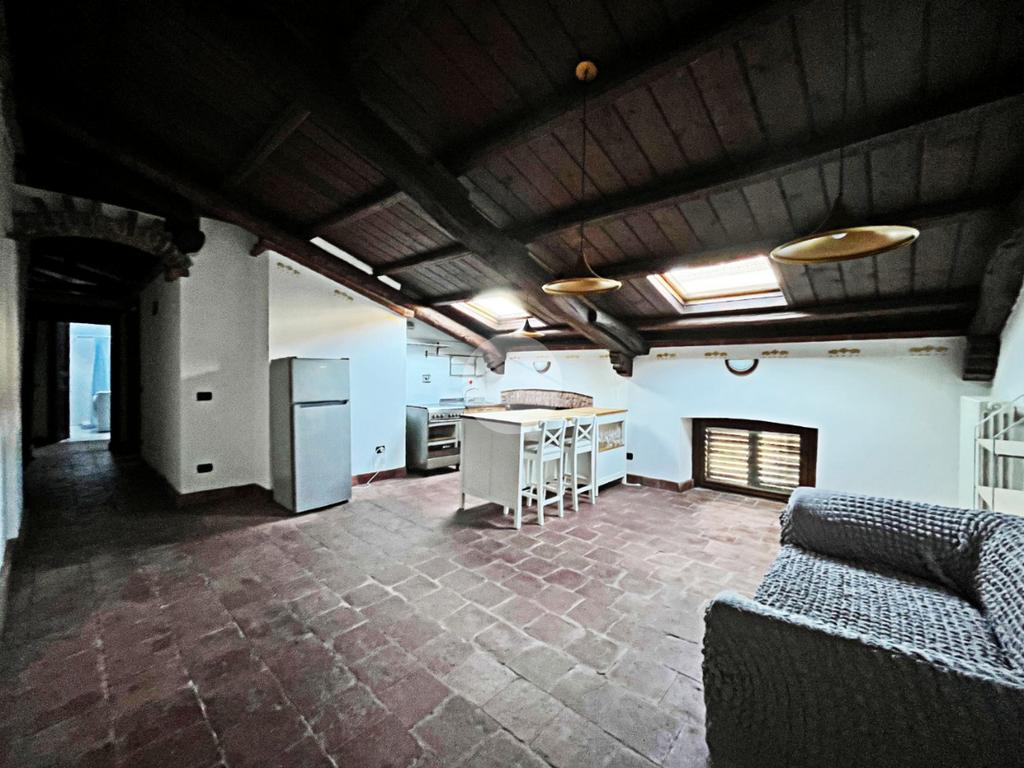 L’ingresso si apre direttamente su un accogliente soggiorno con angolo cottura, uno spazio luminoso e ben distribuito, ideale per la vita quotidiana e i momenti di convivialità. Le travi a vista e le altezze tipiche della mansarda conferiscono all’ambiente un’atmosfera calda e suggestiva.